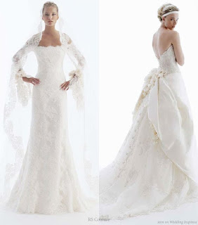 Casaquinho de renda com mangas longas para disfarçar a gordurinha extra das costas e dos braços, porém, o modelo do vestido fica mais adequado as noivas que estejam em forma. rs…